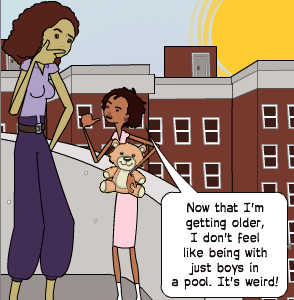 Today, I spend the day with my best friend’s kid again. The poor 8-year-old is the only girl on the block. The other girls are way above her age (14+) and so the other kids her age are boys. The boys were playing outside in a pool today. Normally her friend bangs the door almost every single day to ask if she’d like to come out and play. This time he was so into the fact that there was a pool outside that he forgot to ask my friend’s kid to come and play. She really wanted to go in that pool too. But now that she’s getting a little older, so the kid stated herself, she’s become more shy when being surrounded with too many boys, aparently. So she wasn’t really into the idea of playing in the pool with just boys and her being the only girl. Last year she had no problem with that what-so-ever. But she’s becoming 9 soon, so yeah… I guess it’s… Understandable.