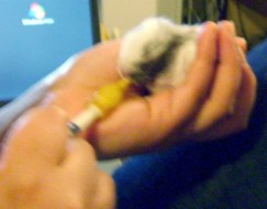 Well, not a full week has passed yet and Mashimaro seems to be feeling bad again. Today she even refused to eat her favorite veggies! I had to shove the lettuce and some home-made bunny food porridge down her throat this morning, just to make sure she keeps eating something. When a rabbit stops eating, it can go down hill really fast 😦 So I had to feed her like a baby…