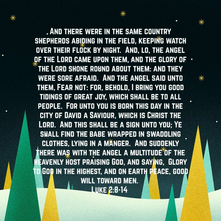 And there were in the same country shepherds abiding in the field, keeping watch over their flock by night. And, lo, the angel of the Lord came upon them, and the glory of the Lord shone round about them: and they were sore afraid. And the angel said unto them, Fear not: for, behold, I bring you good tidings of great joy, which shall be to all people. For unto you is born this day in the city of David a Saviour, which is Christ the Lord. And this shall be a sign unto you; Ye shall find the babe wrapped in swaddling clothes, lying in a manger. And suddenly there was with the angel a multitude of the heavenly host praising God, and saying, Glory to God in the highest, and on earth peace, good will toward men.