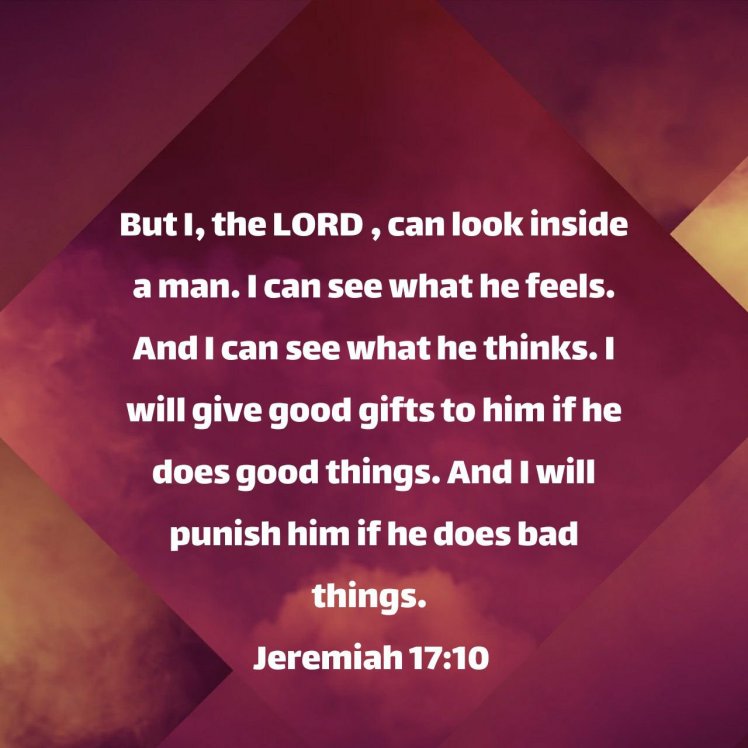 But I, the LORD , can look inside a man. I can see what he feels. And I can see what he thinks. I will give good gifts to him if he does good things. And I will punish him if he does bad things.