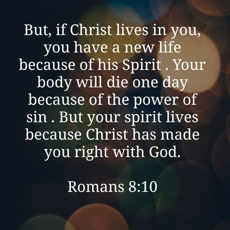 But, if Christ lives in you, you have a new life because of his Spirit . Your body will die one day because of the power of sin . But your spirit lives because Christ has made you right with God.