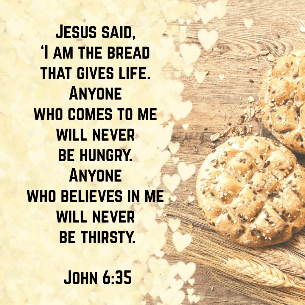 Then Jesus said to them, ‘I am the bread that gives life to people. Anyone who comes to me will never be hungry. Anyone who believes in me will never be thirsty . John 6:35 EASY https://bible.com/bible/2079/jhn.6.35.EASY