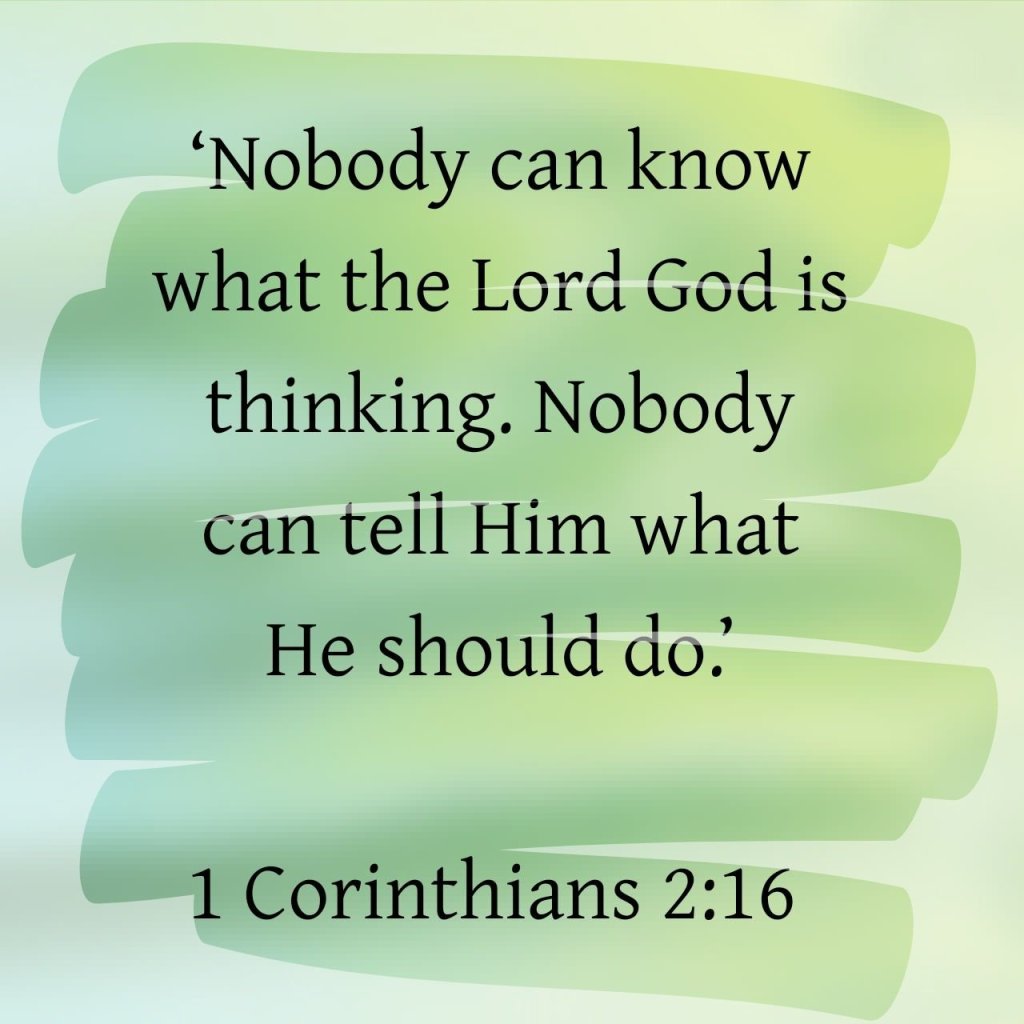As it says in the Bible: ‘Nobody can know what the Lord God is thinking. Nobody can tell him what he should do.’ But we think about these things in the same way that Christ thinks. 1 Corinthians 2:16 EASY https://bible.com/bible/2079/1co.2.16.EASY