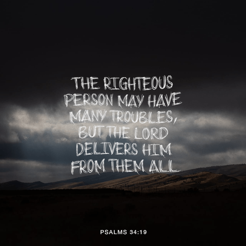 Righteous people may often have troubles, but the Lord saves them from every danger. Psalms 34:19 EASY https://bible.com/verse-of-the-day/psa.34.19/74702