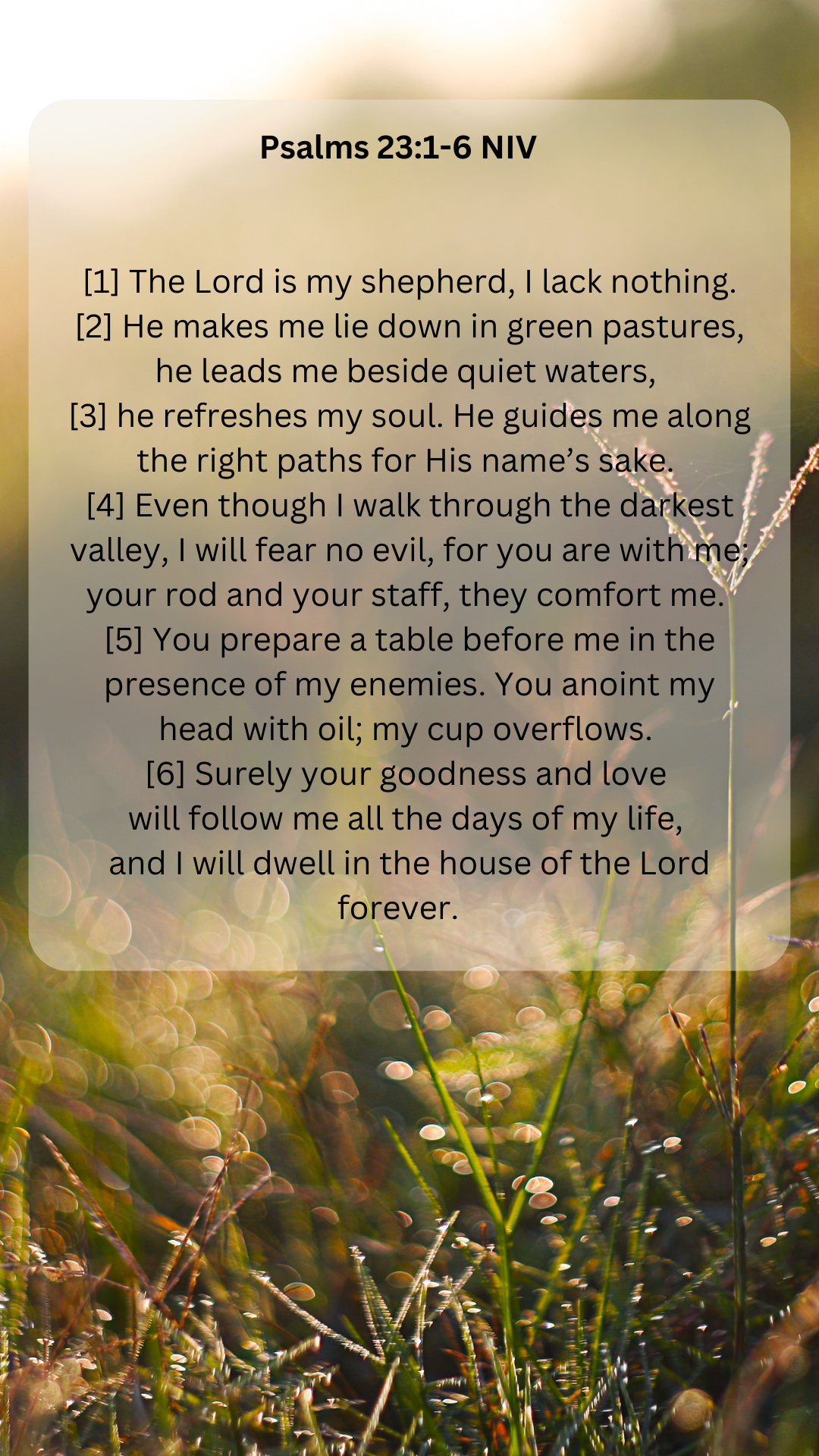 [1] The Lord is my shepherd, I lack nothing. [2] He makes me lie down in green pastures, he leads me beside quiet waters, [3] he refreshes my soul. He guides me along the right paths for his name’s sake. [4] Even though I walk through the darkest valley, I will fear no evil, for you are with me; your rod and your staff, they comfort me. [5] You prepare a table before me in the presence of my enemies. You anoint my head with oil; my cup overflows. [6] Surely your goodness and love will follow me all the days of my life, and I will dwell in the house of the Lord forever.